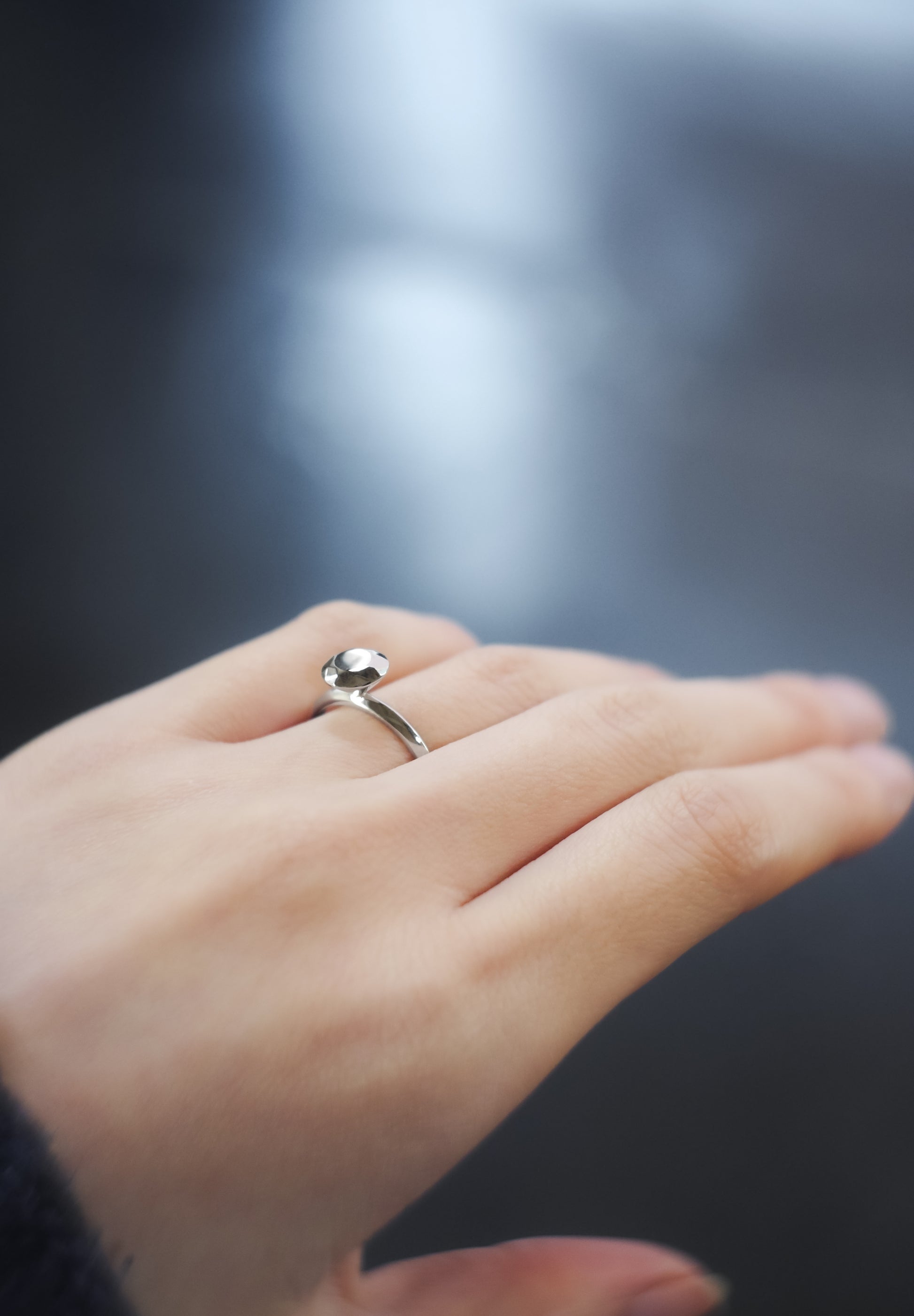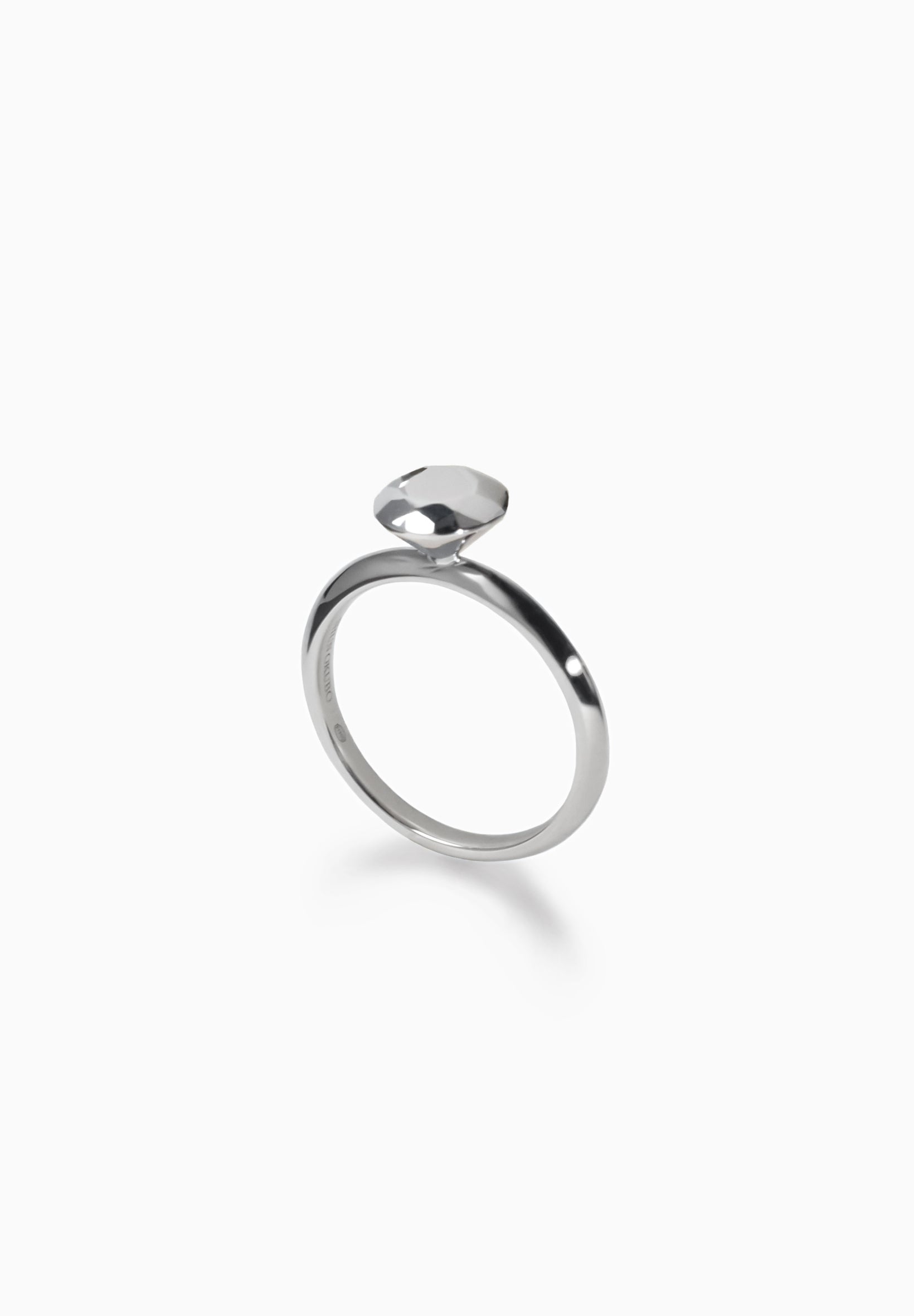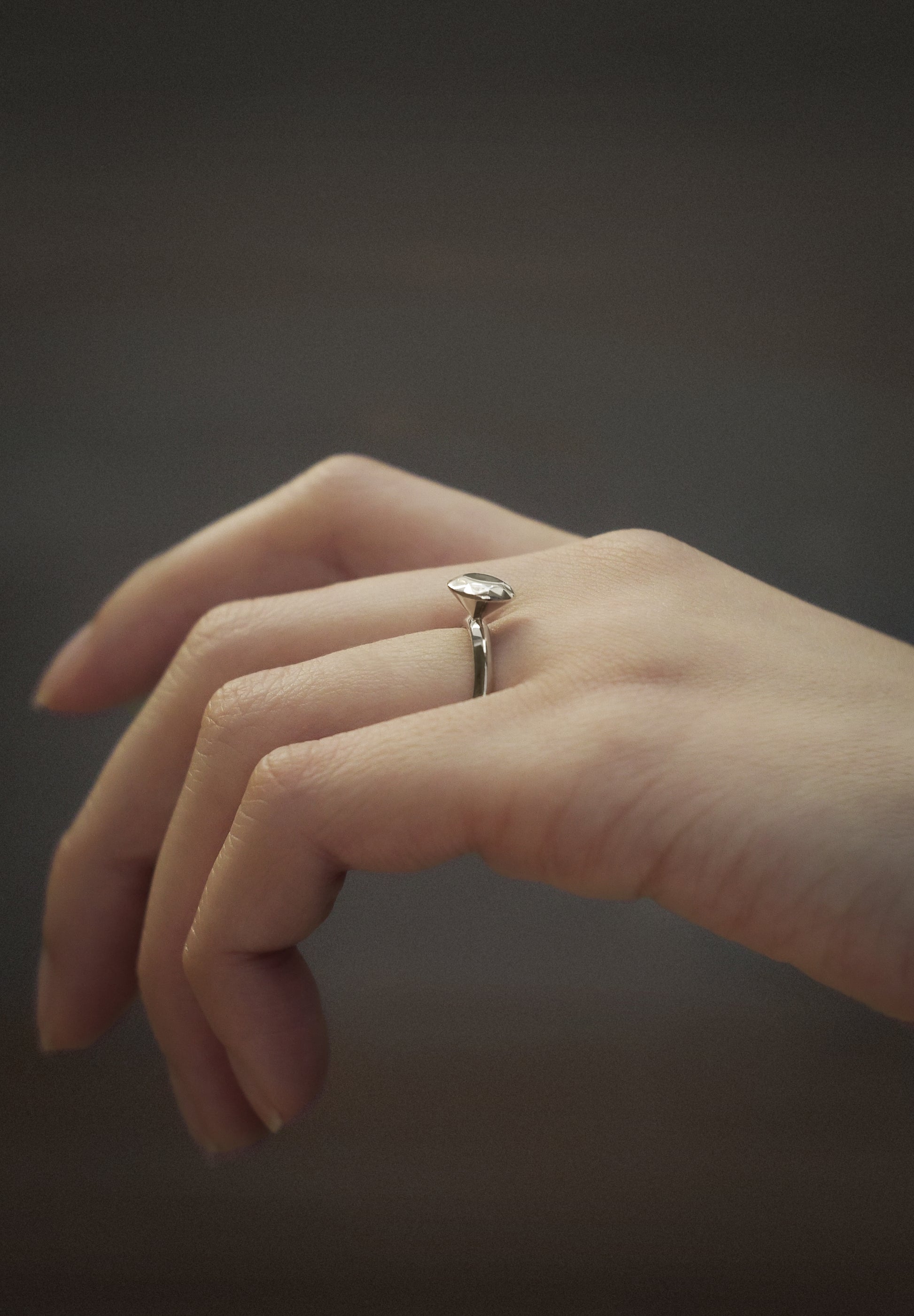 An item that reproduces the shape of a cut diamond in metal. The contrast between the matte finish on the top and the gloss on the ring is symbolic. Architect Louis Kahn said, ``All matter is what light is after it has burned out.'' By intentionally giving the surface a rough finish, we express the momentary state when light turns into substance. Guided by Khan's words,SHUN OKUBOIt's a very poetic item.