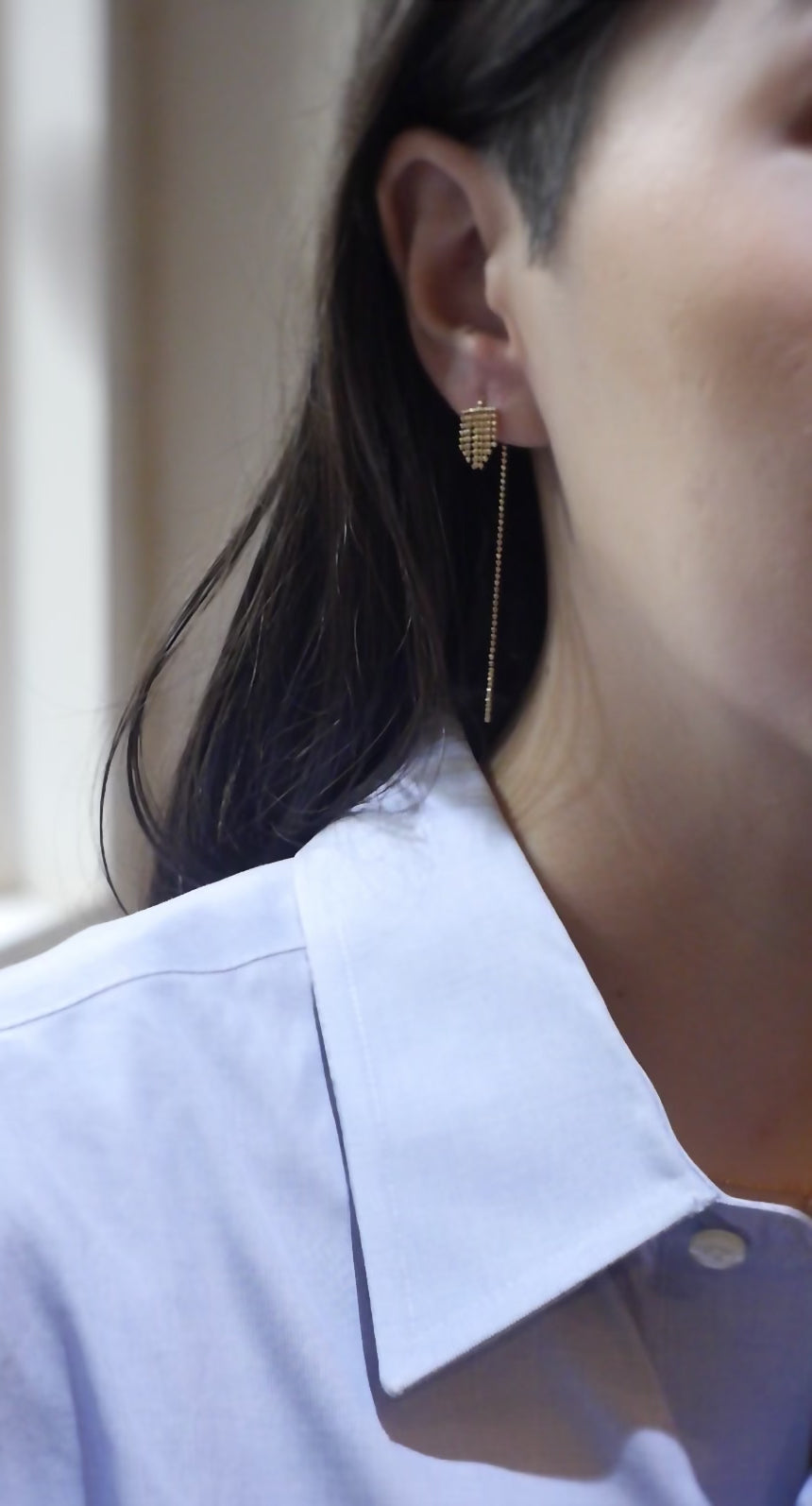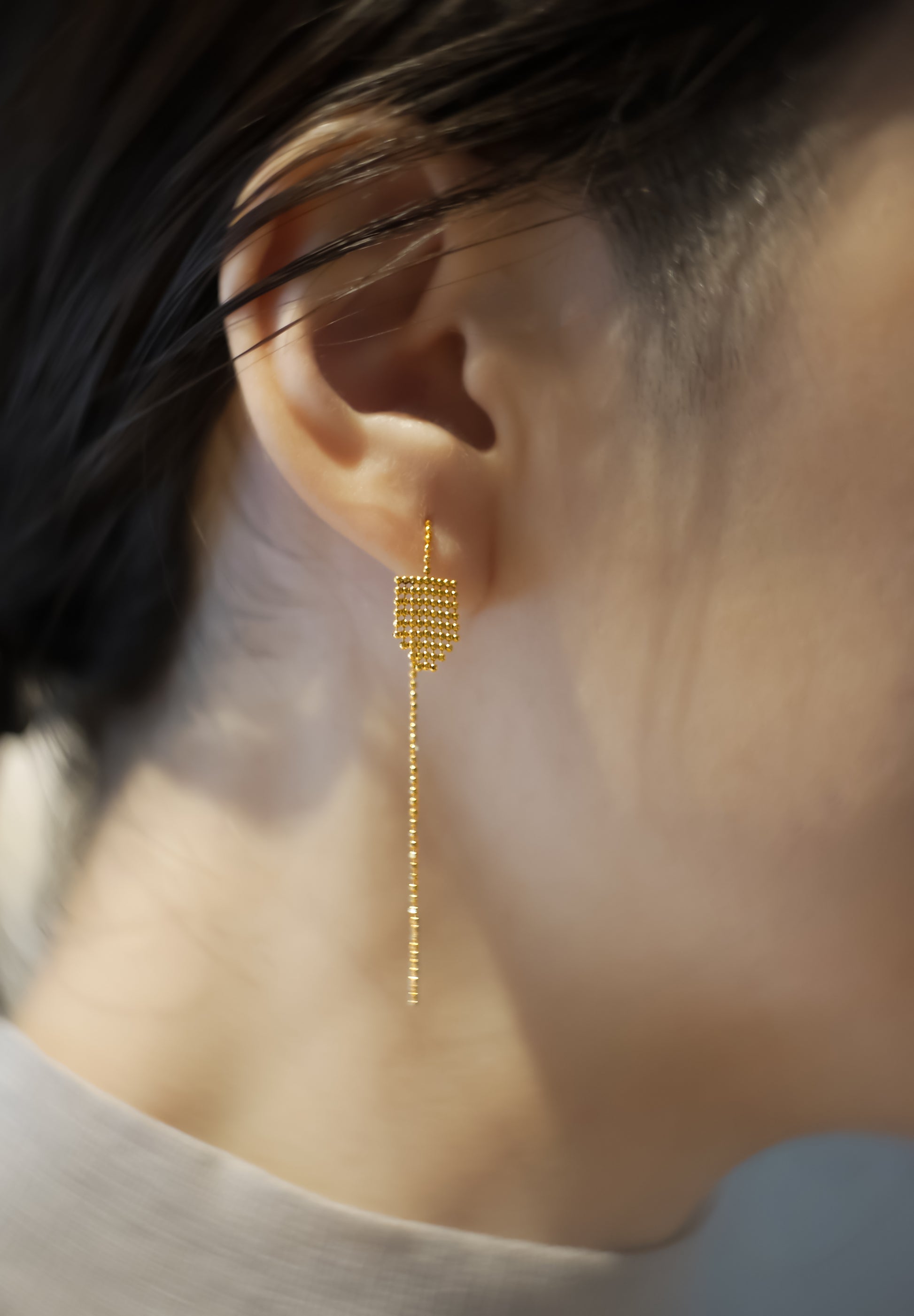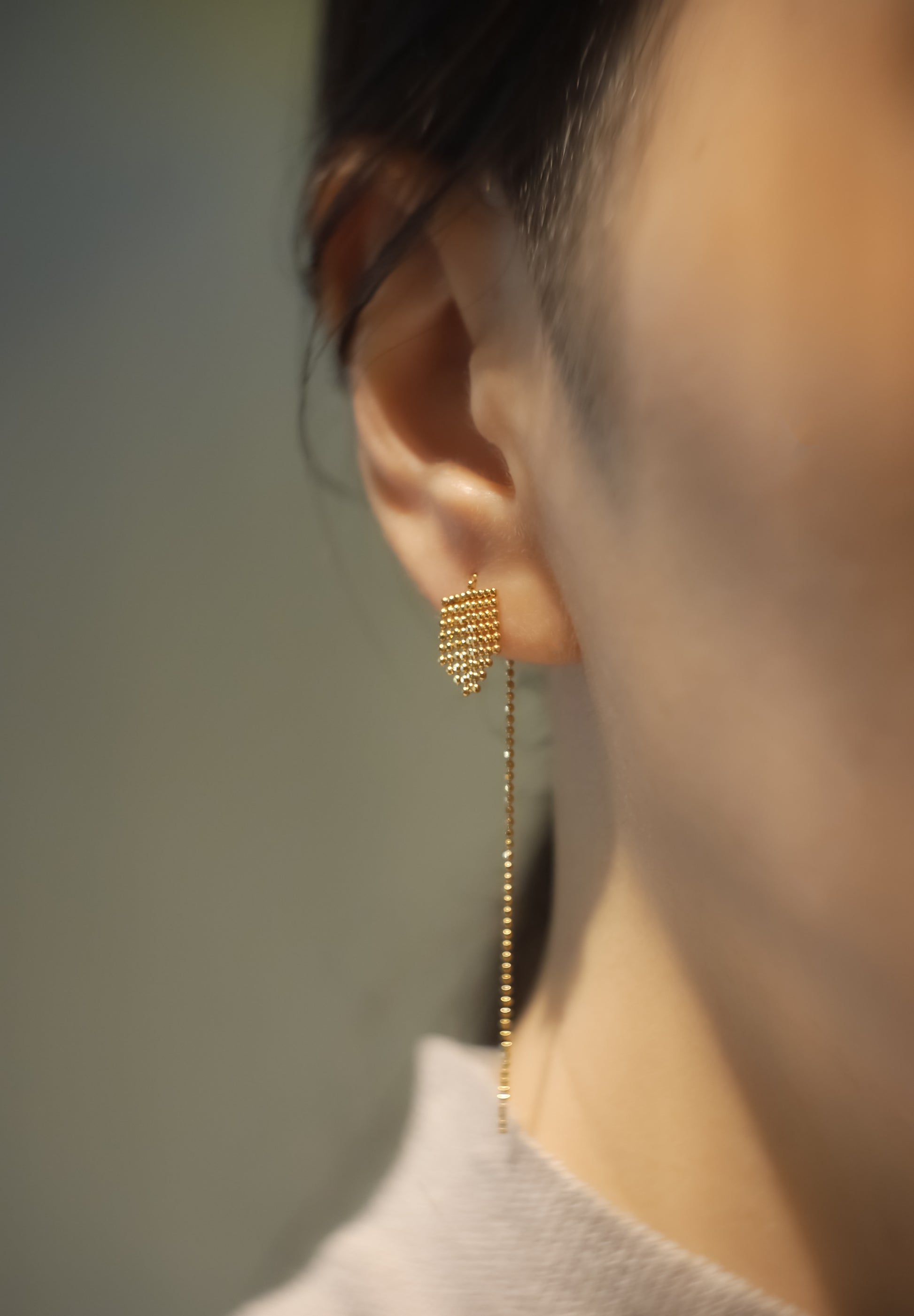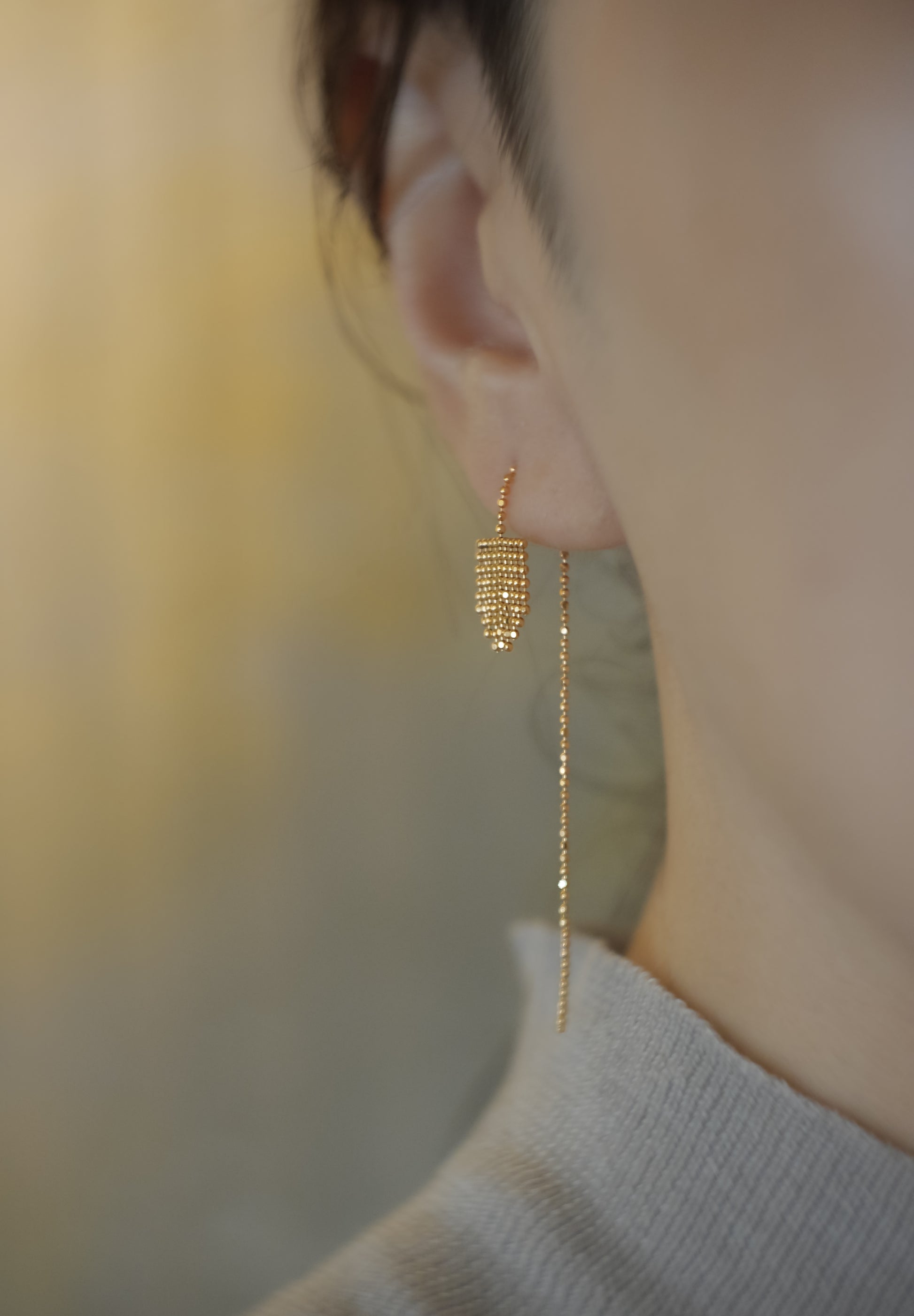 約1.0mmのボールカットチェーンが、房のように重なり、繋がり、美しいシルエットを形成しています。また、ボールチェーンを溶接し固める技術により、無駄を削ぎ落とした完全にミニマルなスタイルを実現させました。