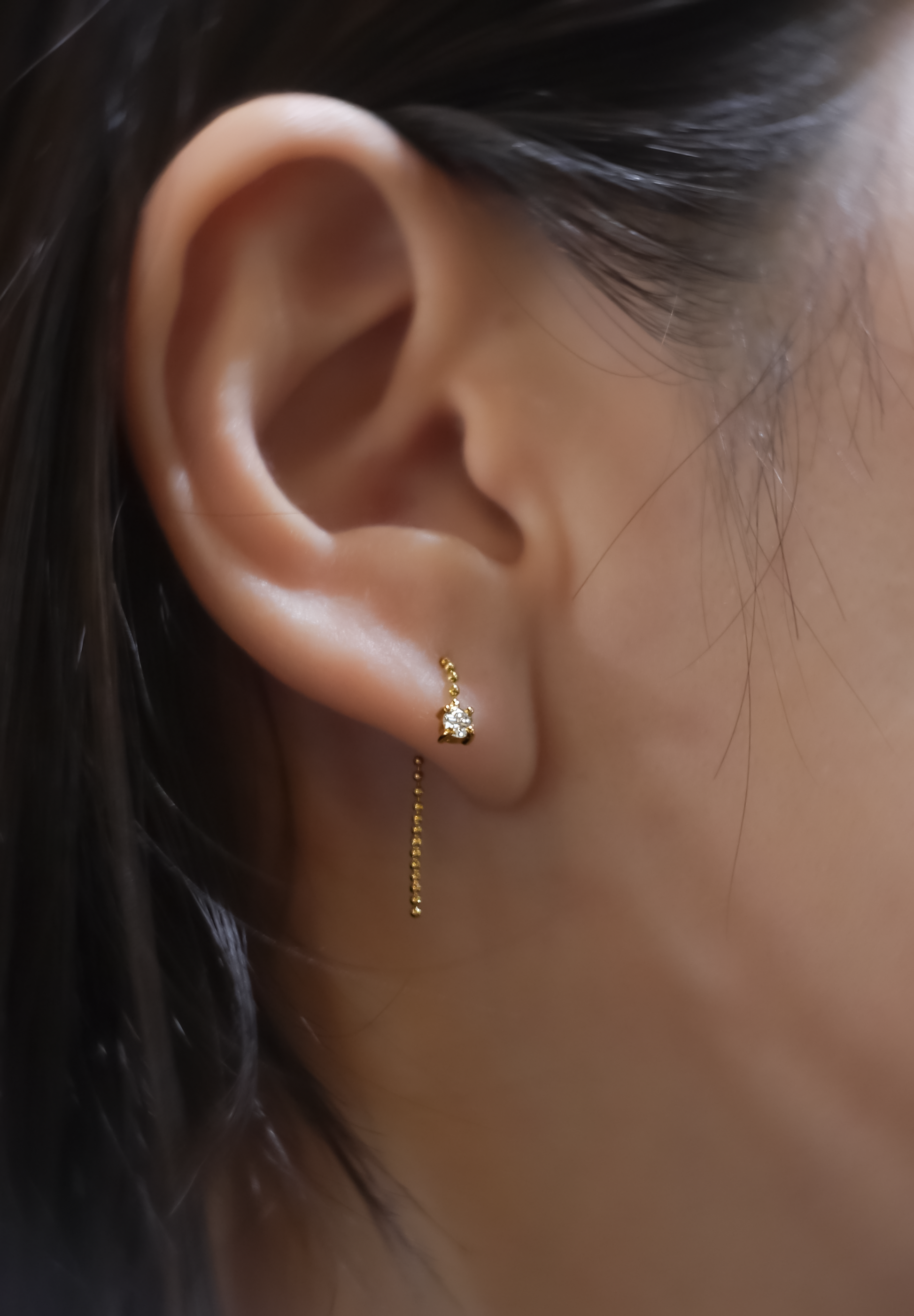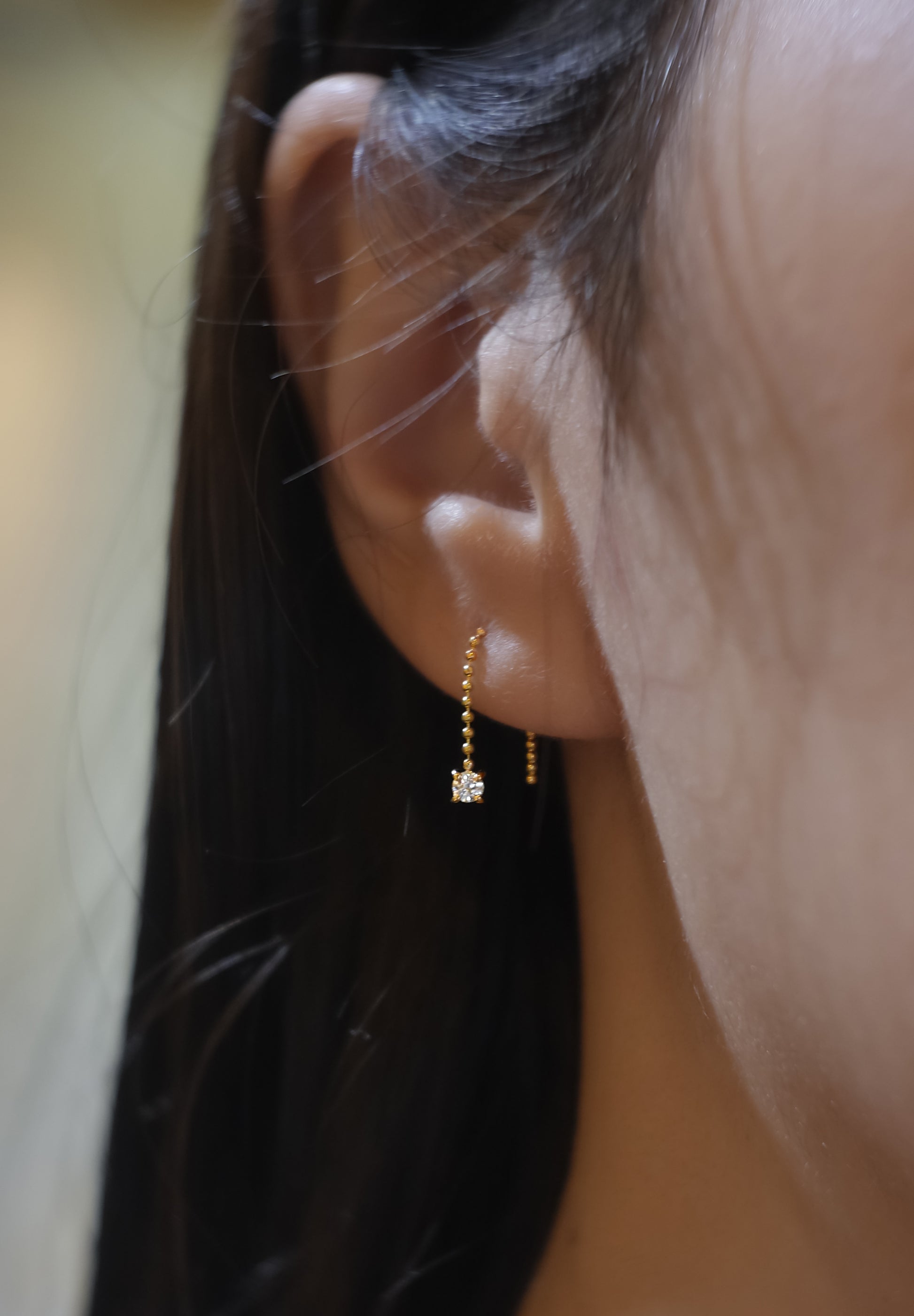 チェーンの先端が直線の形状に固められており、装着時にポストの役割をはたします。チェーンの長さも耳に収まりが良く、上品な雰囲気のダイヤモンドのピアスです。カジュアルにも、フォーマルにもご活躍いただける、洗練されたパーフェクトな現代的デザイン。