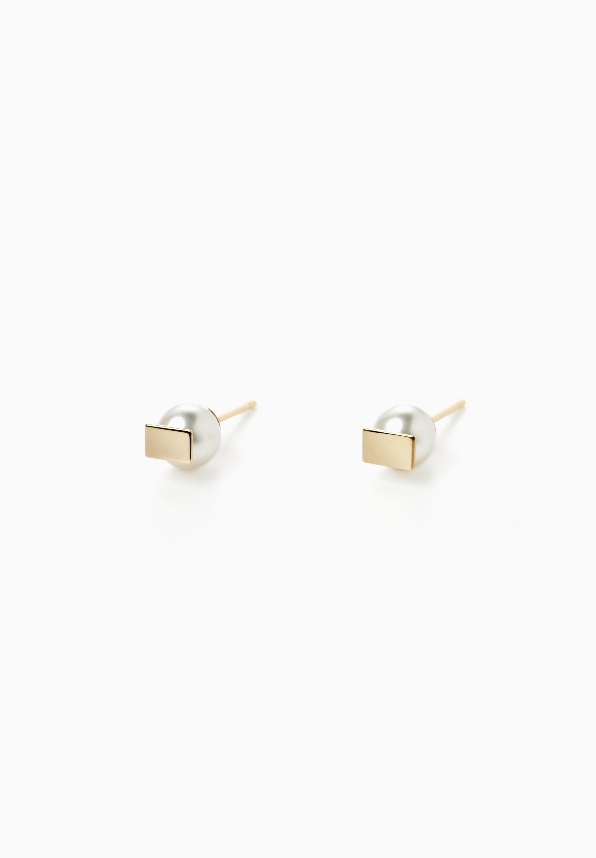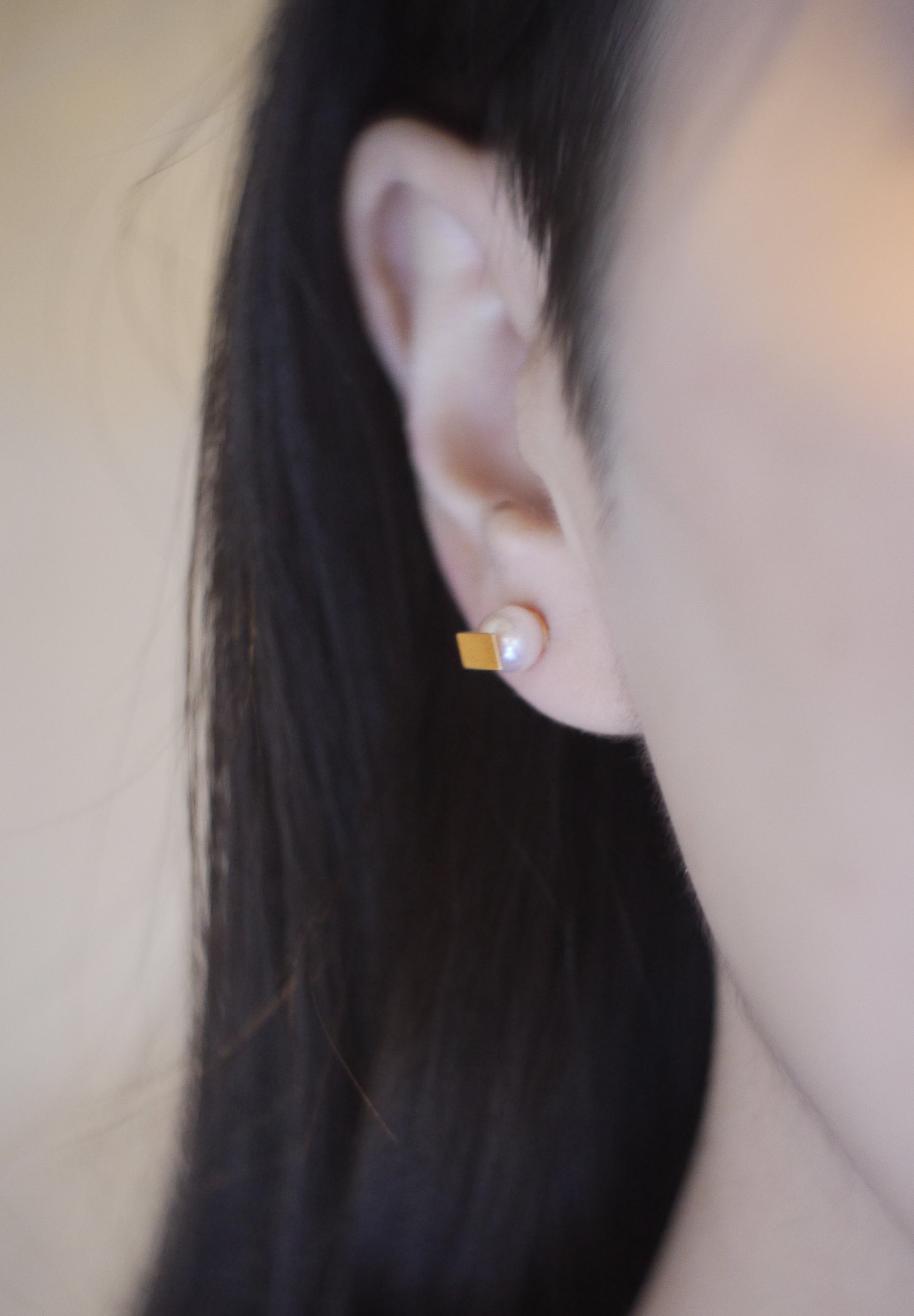 あえて真珠を隠すようにK18YGの長方形のプレートが前面に配置されることで、クラシカルな一粒パールのピアスのデザインが現代的な雰囲気を纏います。隠された真珠はミステリアスでありながら、K18のプレートと共にスタイリッシュな美しさを表現します。カジュアルなスタイルからフォーマルなスタイルまで、幅広く活躍するアイテムですが、特にシャツやスーツスタイルなど少し緊張感のある服装にも相性が良く、シャープな印象の中にも品のある華やかさを与えてくれます。