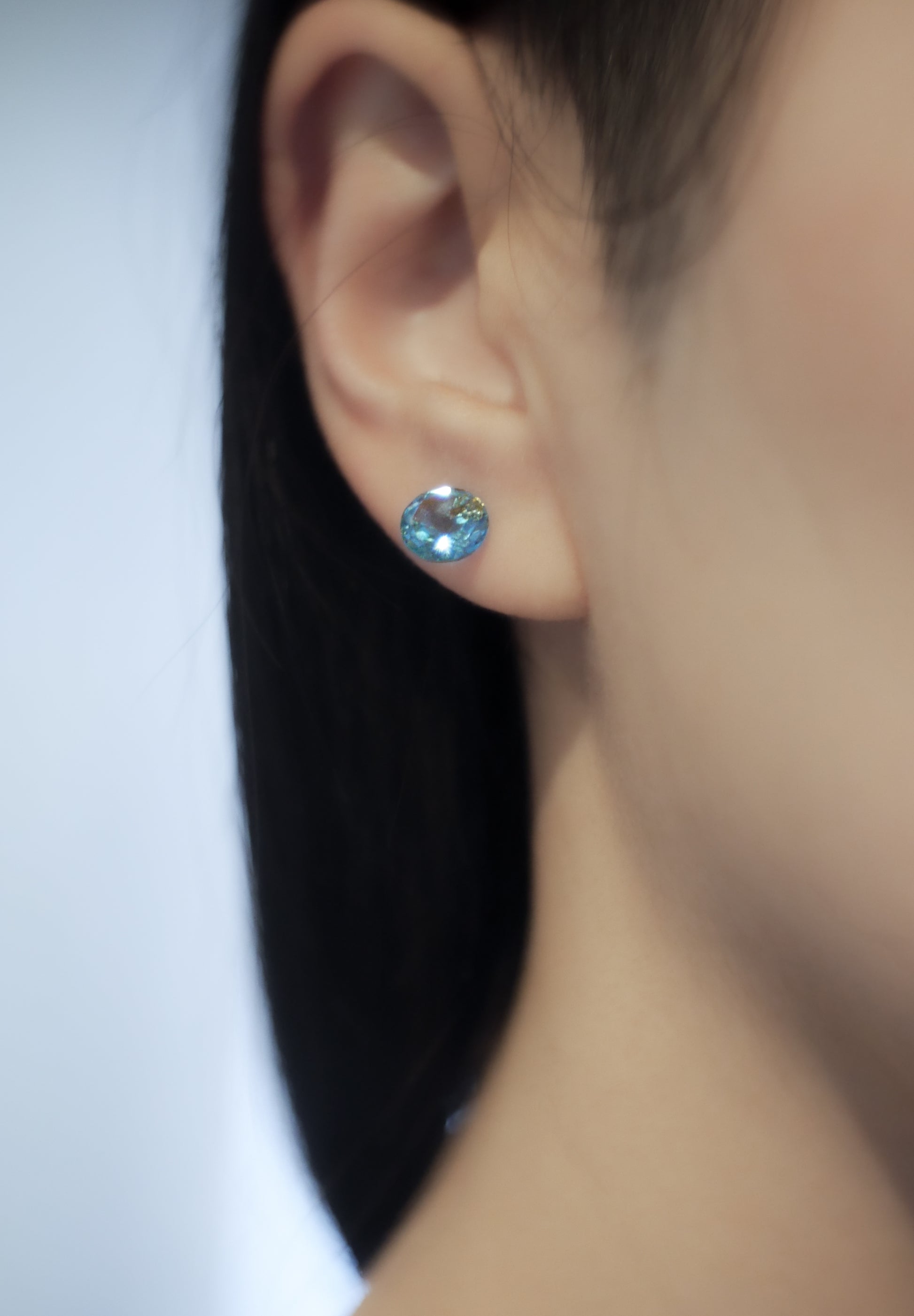 ブルートパーズのラウンドカットのピアス、オプティクス(OPTICKS)。石枠を使わず、ラウンドカットの石にさらに加工を施し、石そのものが耳に装着されるようにデザインされている。一切の無駄のない、半貴石のピュアネスを身につけるミニマルなデザイン。