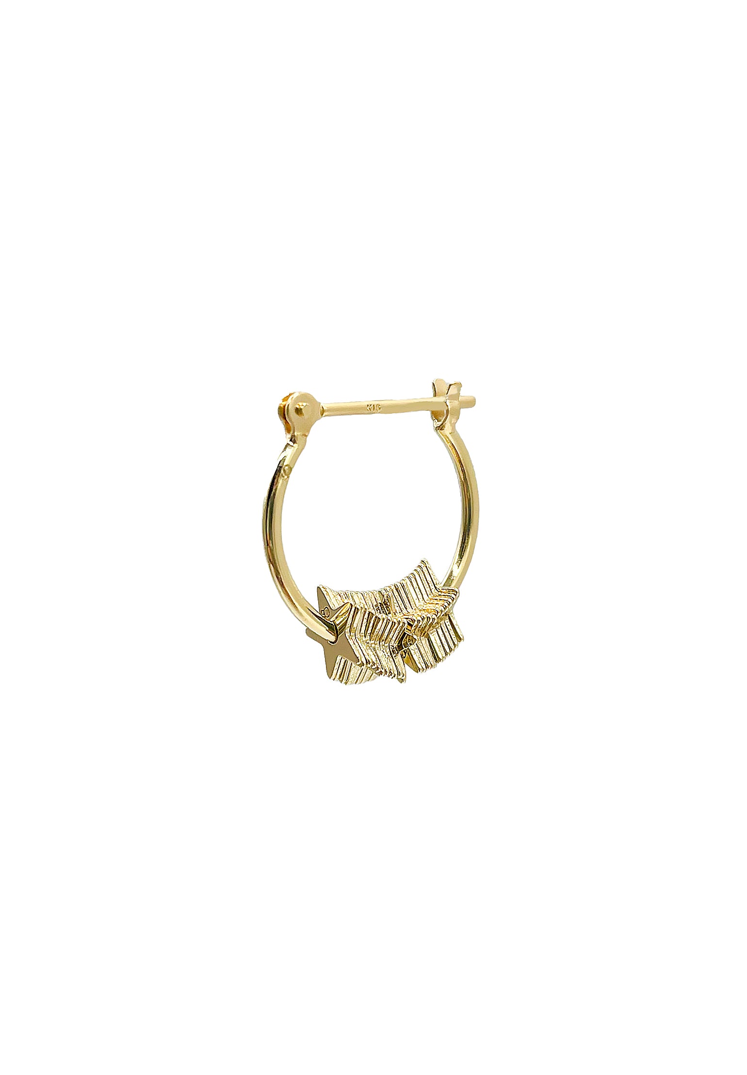 星のプレートが重なり、連なったフープピアス、ステラ。連なったプレートは一つのオブジェクトにも見え、且つ一枚一枚は独立して揺れる。繊細でいて力強い、アーティスティックなアイテム。