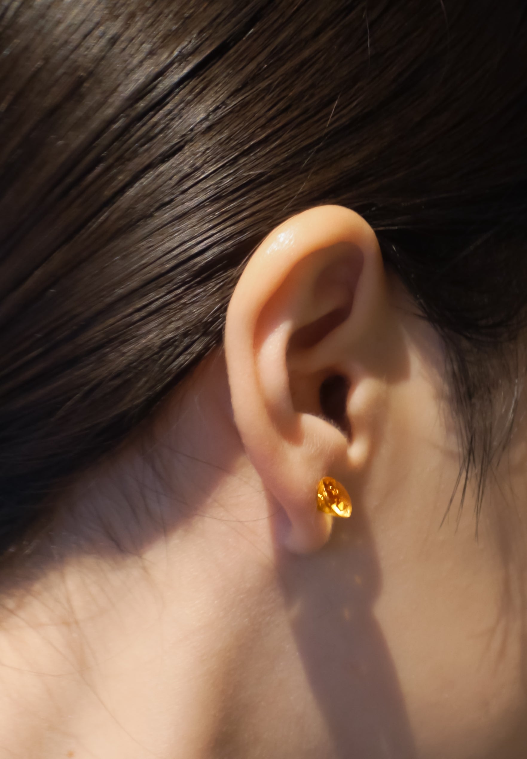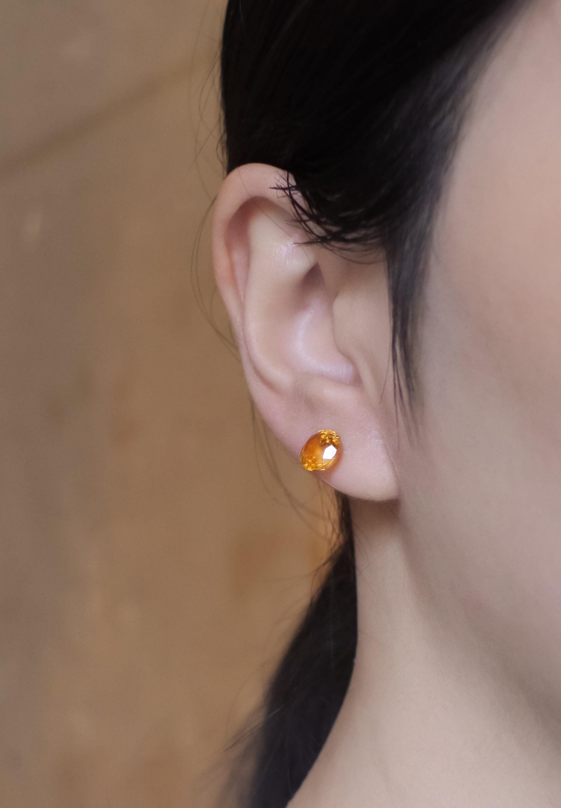 シトリンのラウンドカットのピアス、オプティクス(OPTICKS)。石枠を使わず、ラウンドカットの石にさらに加工を施し、石そのものが耳に装着されるようにデザインされている。一切の無駄のない、半貴石のピュアネスを身につけるミニマルなデザイン。