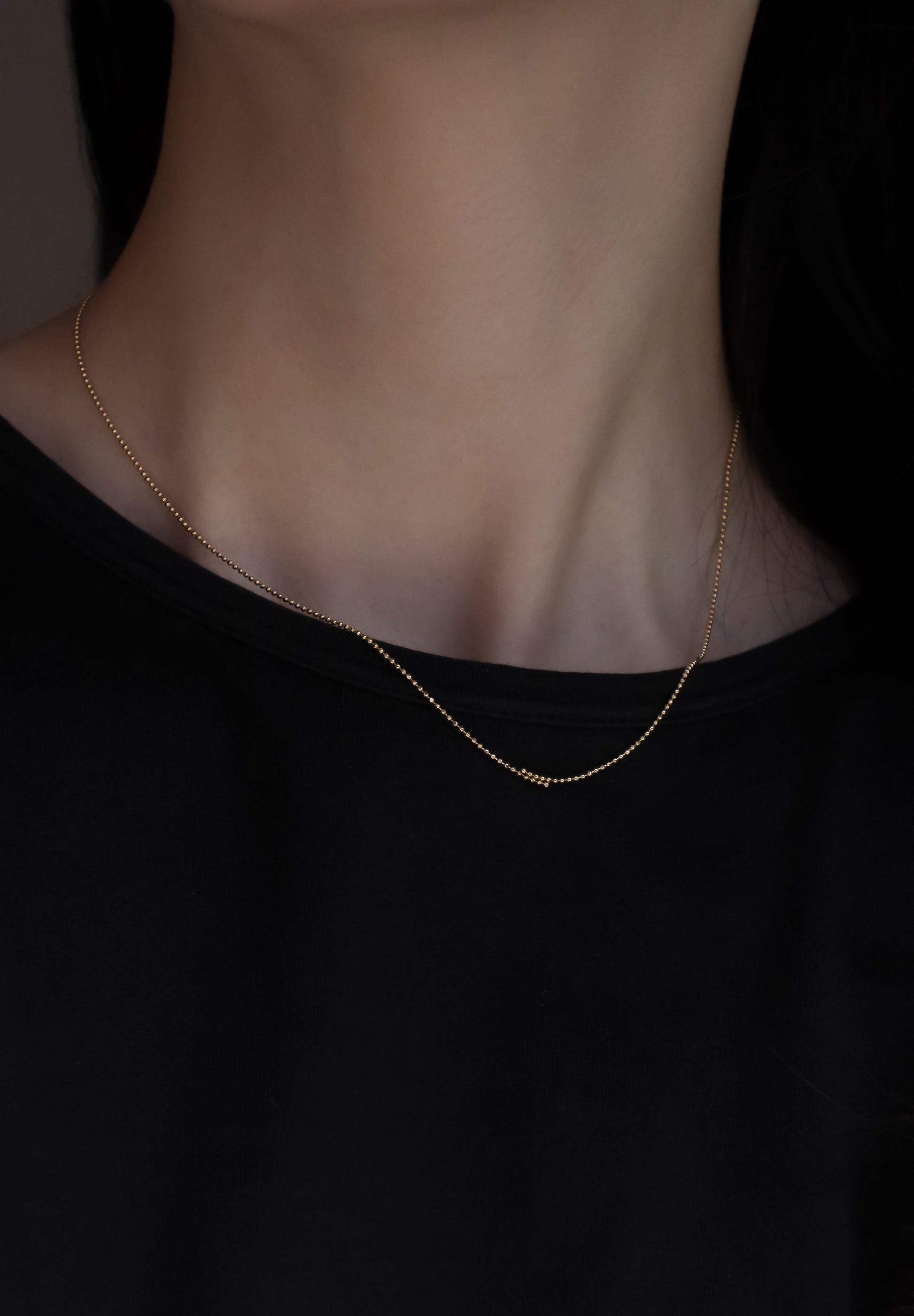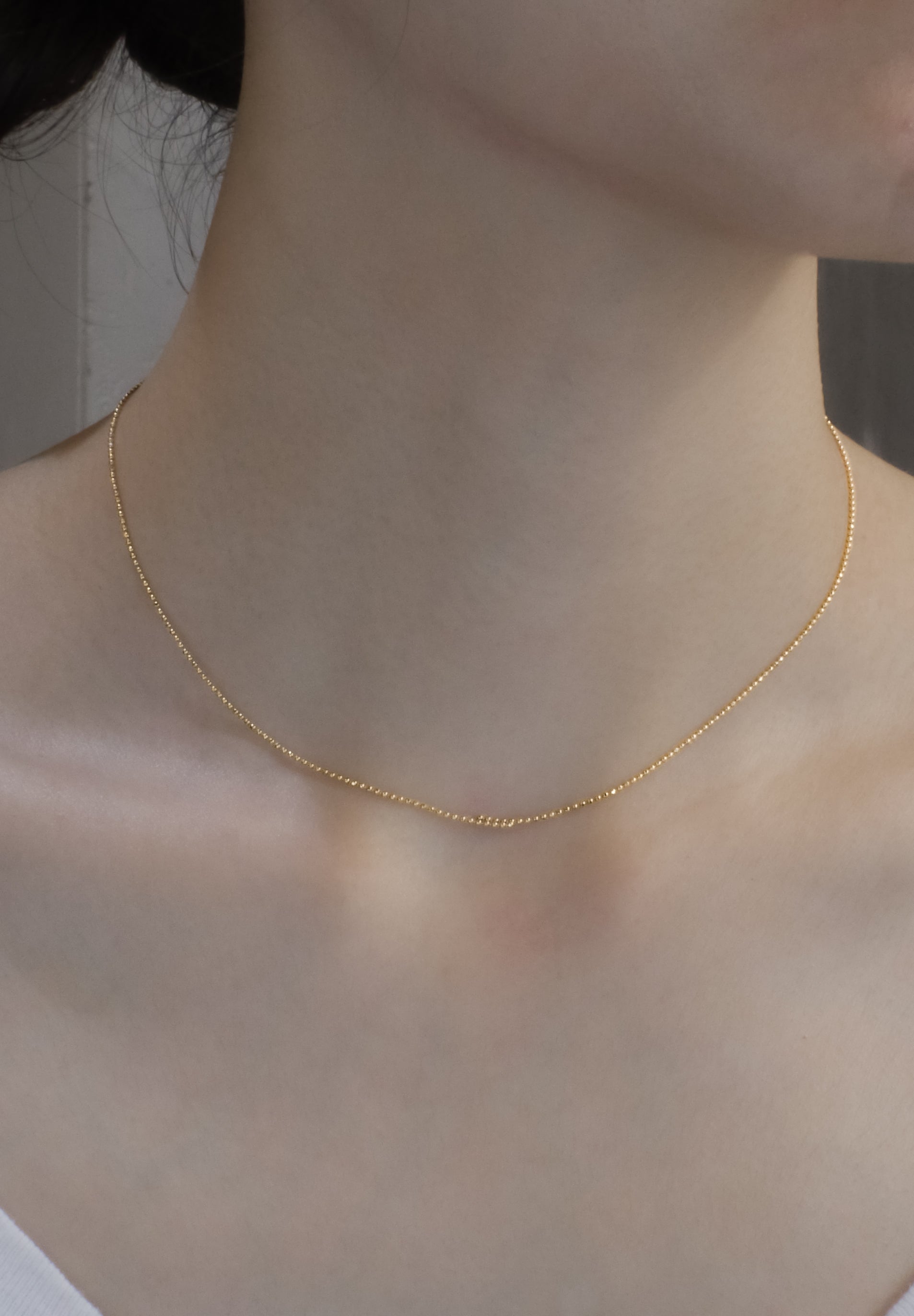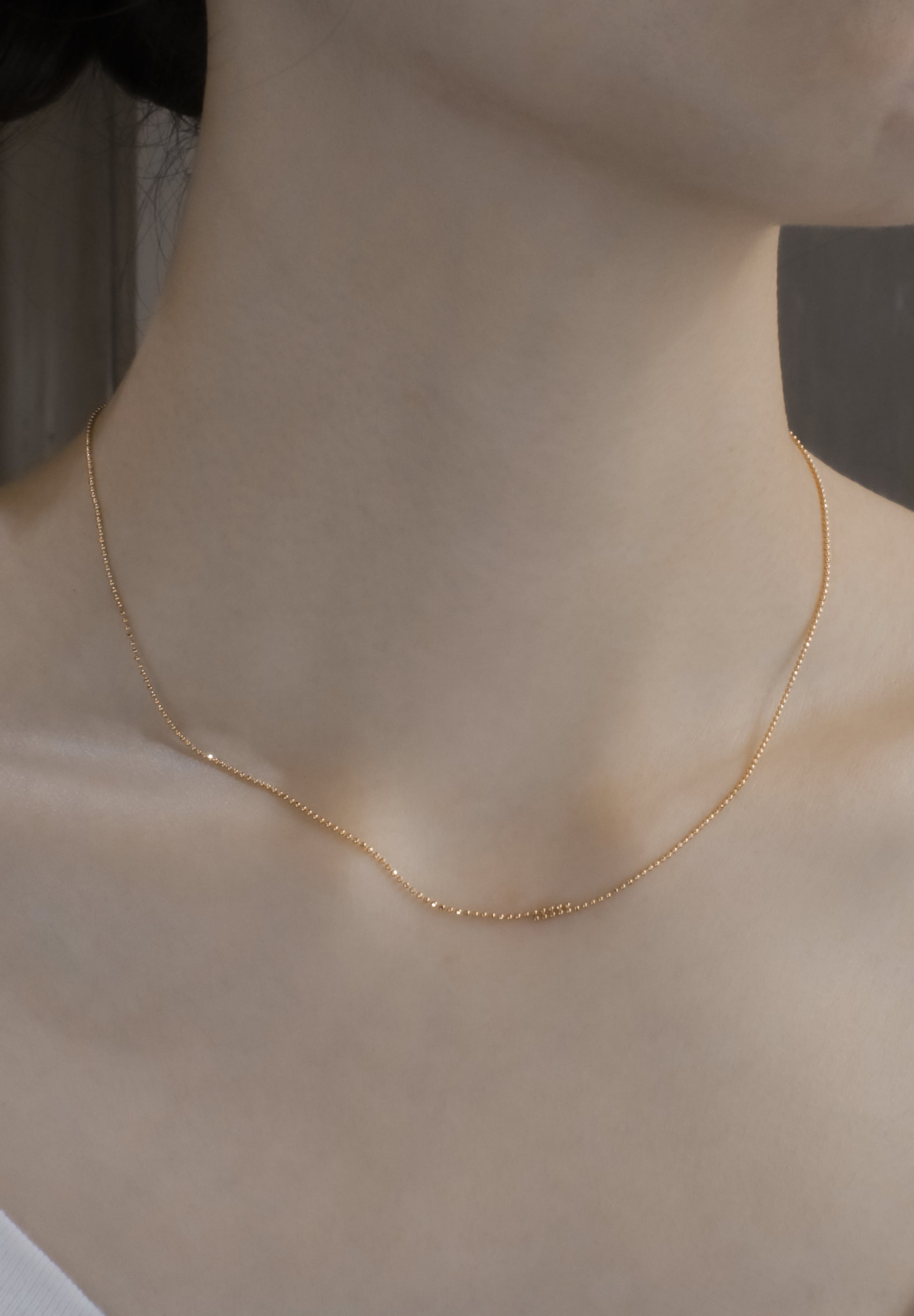 Overlap Necklaceはトップでチェーンを部分的に2本重ねた、極ミニマルなさりげない装飾のネックレスです。重なりが10mmのOverlapはさりげないながらもアンニュイな印象を与えます。