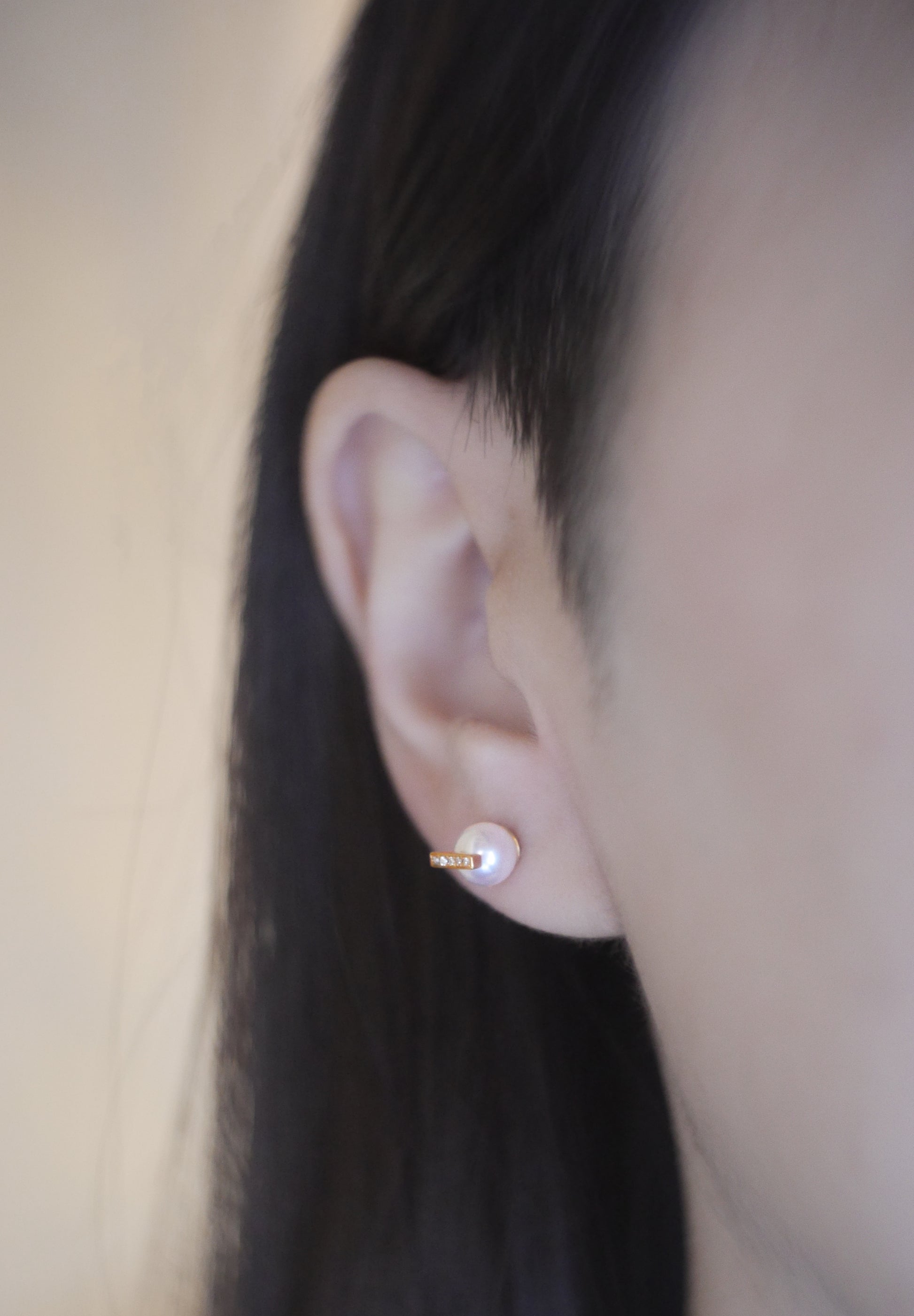 あえて真珠を隠すようにダイヤモンドがあしらわれたK18YGの長方形のパーツを全面に配置。クラシカルな一粒パールのピアスのデザインが現代的な雰囲気を纏います。K18とダイヤモンドのパーツに姿を隠された真珠はミステリアスでありながらスタイリッシュな美しさを表現します。カジュアルなスタイルからフォーマルなスタイルまで、幅広く活躍するアイテムですが、特にシャツやスーツスタイルなど少し緊張感のある服装にも相性が良く、シャープな印象の中にも品のある華やかさを与えてくれます。
