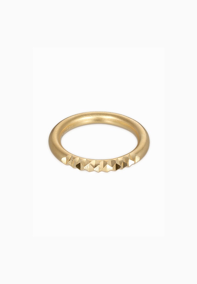 Φ2.8mmのリングの1/4部分を彫り出して装飾を施したリング。丸い曲面はマット仕上げで落ち着きのあるテクスチャー、掘削した部分は荒々しくもまばゆい輝きを備え、その対比が美しいリング。特殊な掘削機で彫刻しており、彫られた部分は眩く反射します。 Radioheadのアルバム『KID A』からインスピレーションを得たアイテム。 *表示の指のサイズ以外の大きさもお作り可能です。 ぜひお問い合わせください。 <e-shop@shunokubo.com>まで