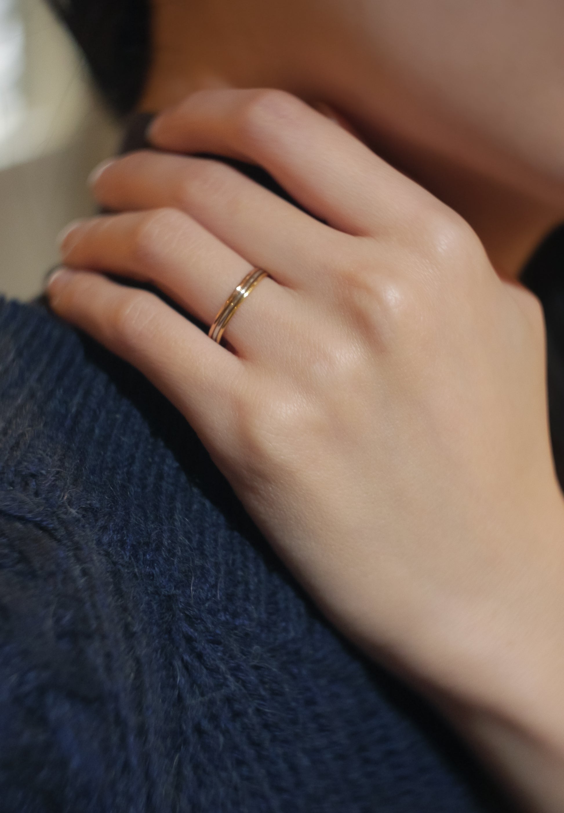 K18イエローゴールド、K18ピンクゴールド、Pt900が3層になったリング。3つの異なった素材のリングを、高い技術を持つSHUN OKUBOのエンジニアが丁寧に1つのリングに作り上げました。トリニティは3重の意味を持ち、ピンクゴールドは愛を、イエローゴールドは忠誠を、プラチナは友情を意味します。