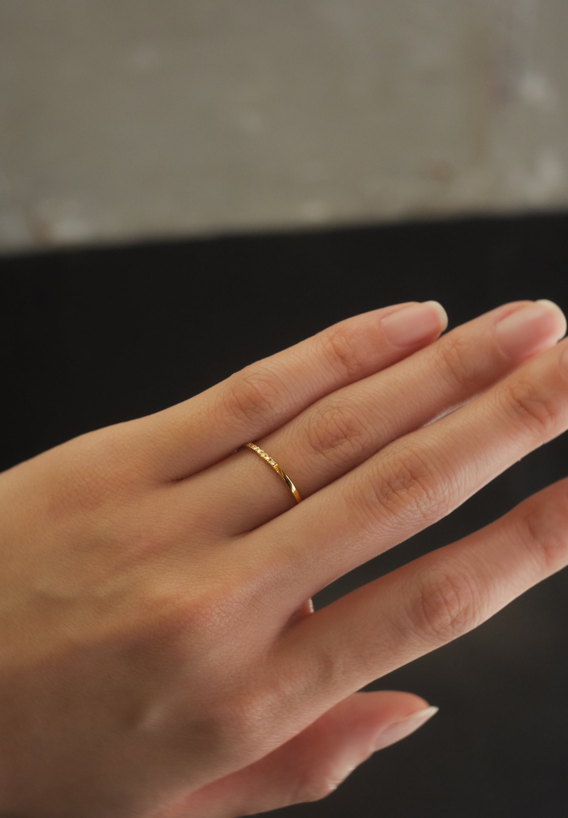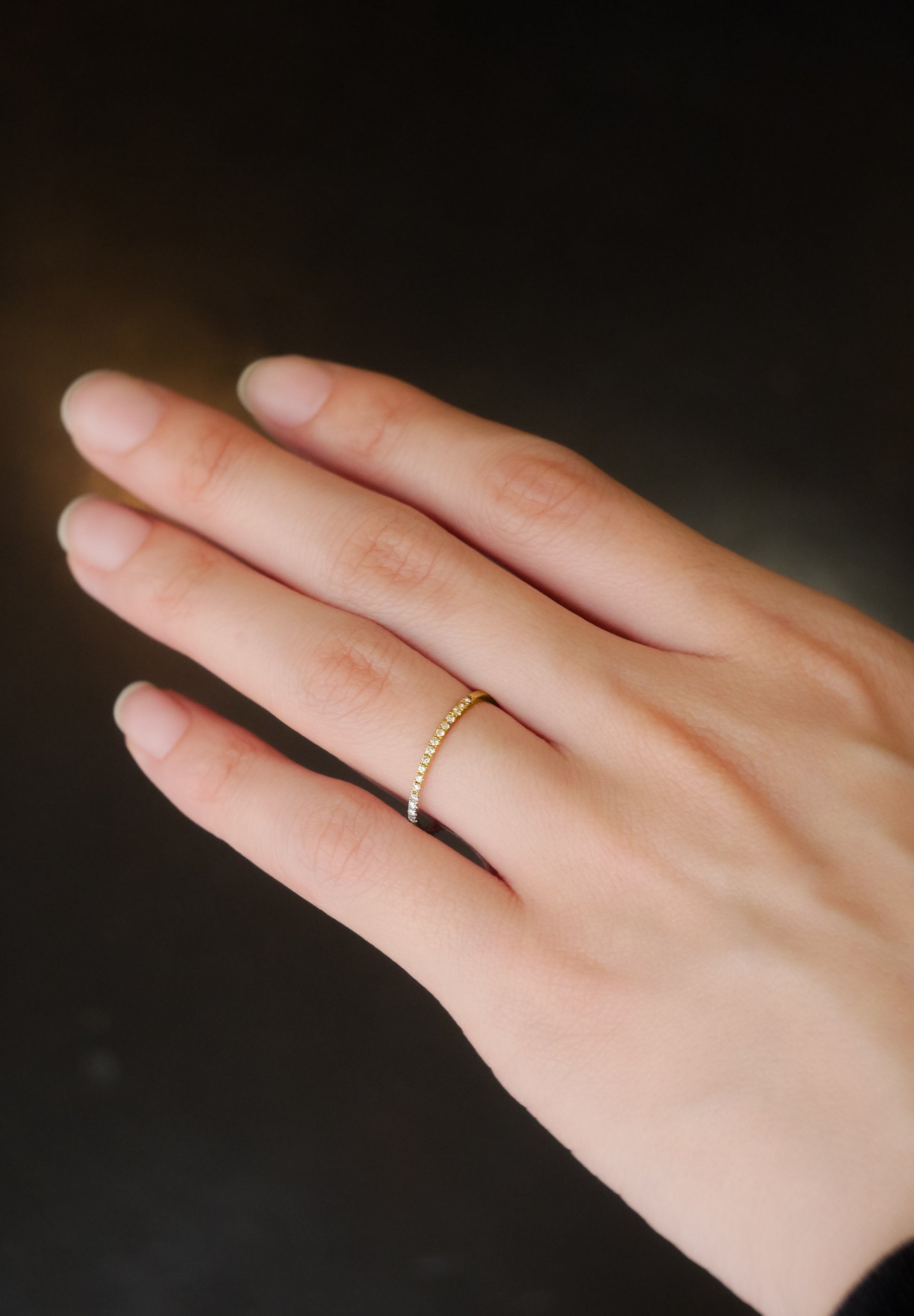 這款戒指一半是鉑金,一半是18K黃金。它的方形輪廓由方形金屬絲構成。這款戒指通常成對購買,象徵彼此分享一半的理念。鑽石鑲嵌在戒指的一半(週長的一半)上。